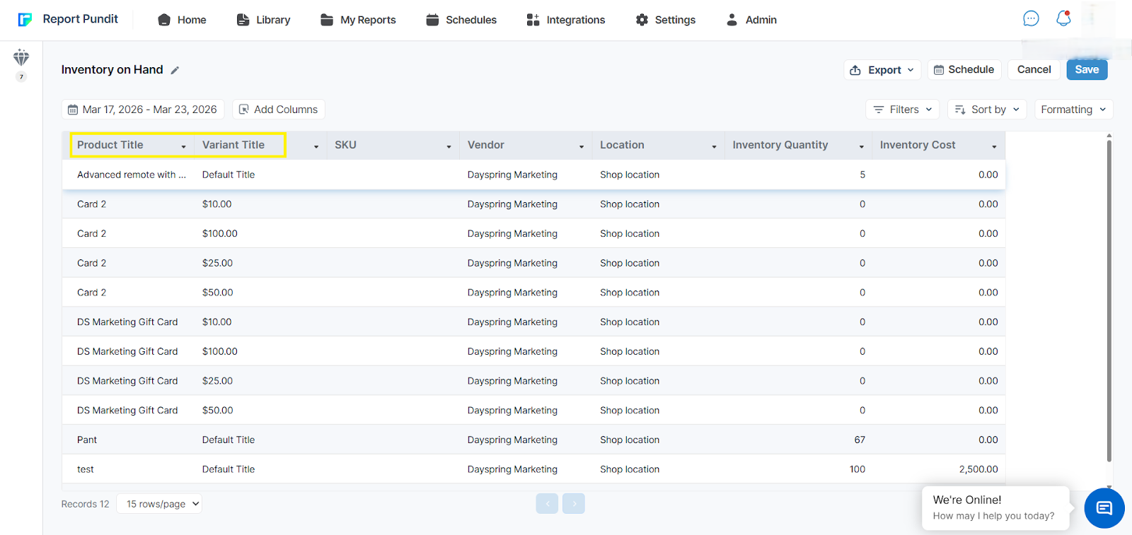 Instead of switching between multiple reports, tools like Report Pundit allow merchants to combine stock levels, inventory movement, location data, and inventory value into a single, unified report.