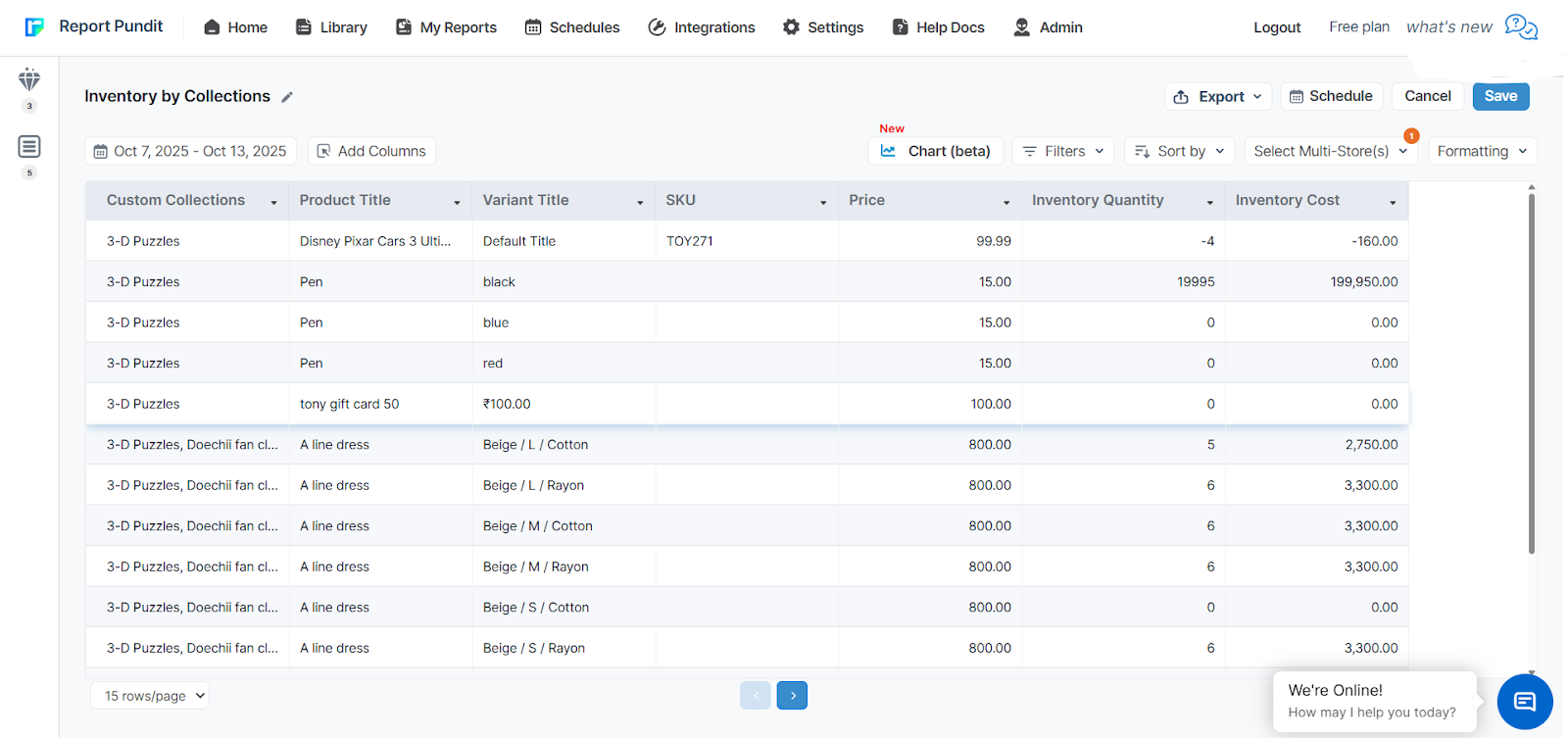 When the merchant reached out, our support team customized the data directly into the report. This made it possible to generate a custom Inventory by Collection report with the following fields: