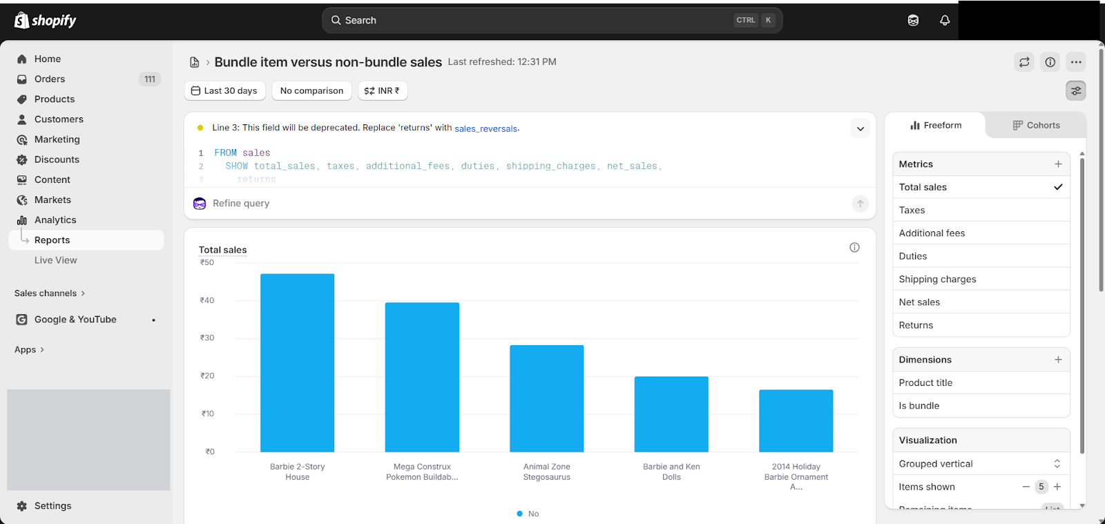 - Discount Impact: Bundles are priced lower than the combined value of individual items. While this attracts customers, it also reduces margins, and Shopify reports do not clearly show the gap between bundle pricing and individual item value.