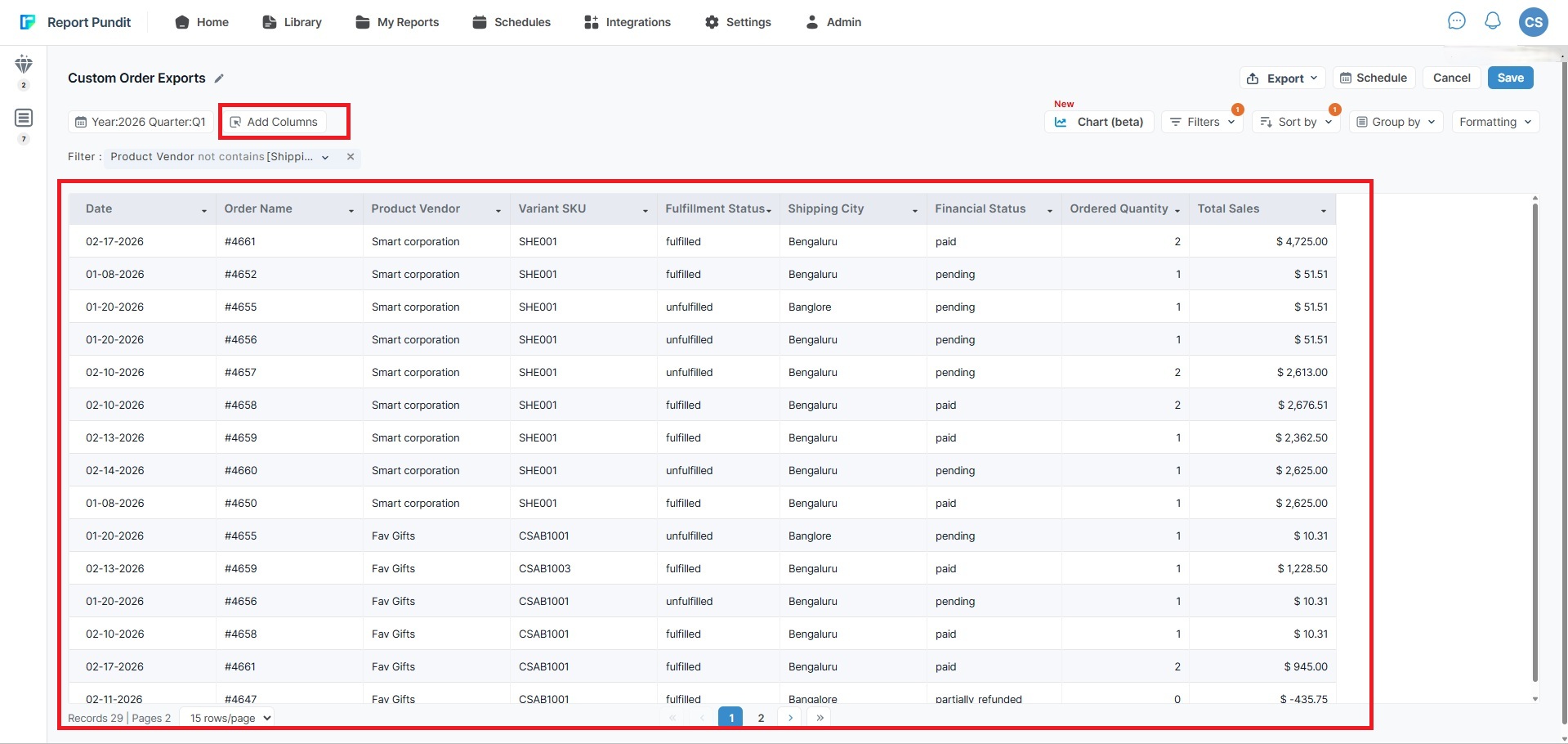 Report Pundit allows you to build fully customized order exports by selecting required fields such as SKU, quantity, vendor, shipping details, cost, and tags. You can format the report based on each team’s workflow and automate delivery on a schedule.