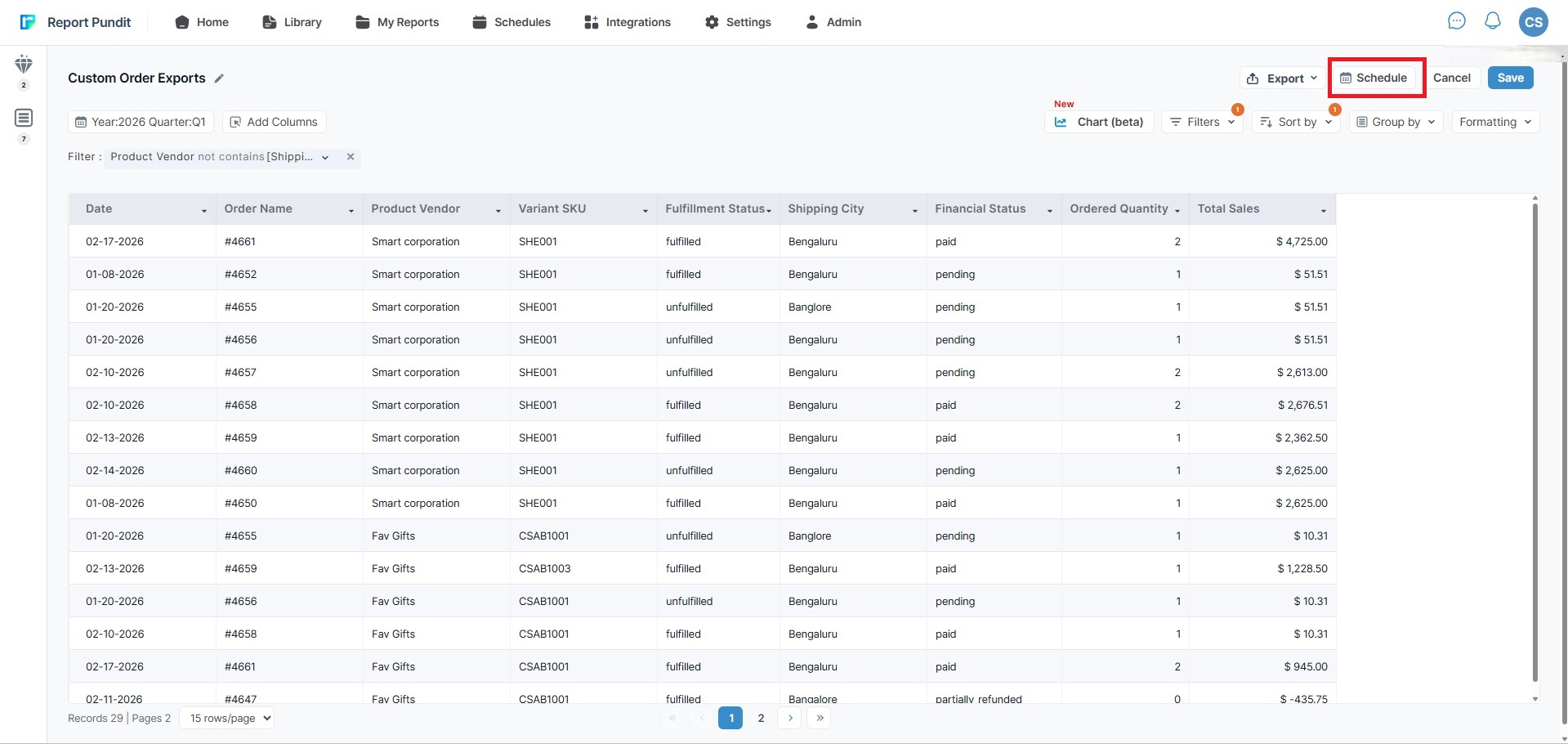 The most effective way to automate exports is by using advanced reporting apps such as Report Pundit. These tools allow you to create custom reports filtered by vendor, fulfillment status, warehouse location, tags, or date range. Once configured, you can schedule these reports to run automatically on a daily, hourly, or weekly basis. The system then delivers the files via email, secure download link, or even direct integrations, eliminating the need for manual CSV downloads.