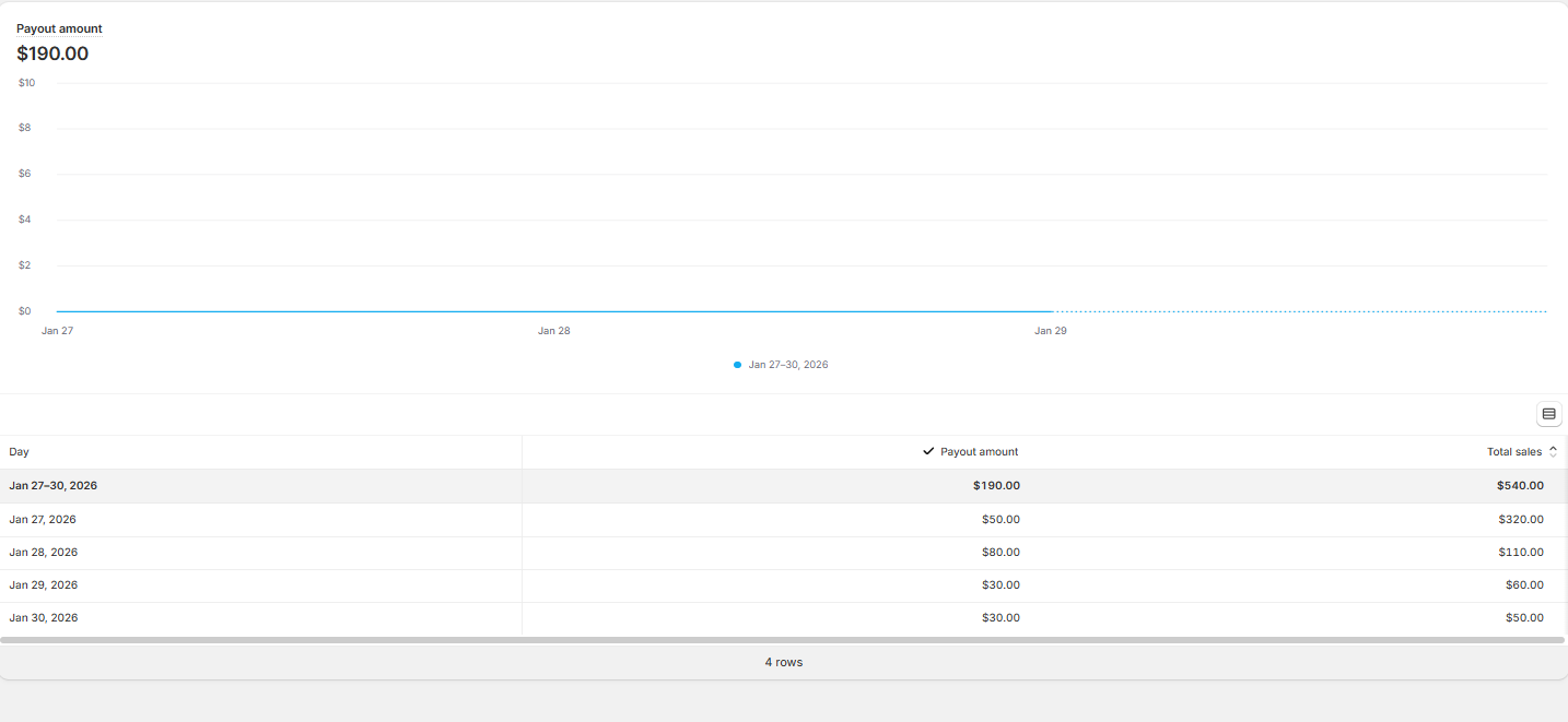 The payout for Jan 27–30, 2026 totals $190, but this amount is grouped by payout date, not by the actual sales dates. Meanwhile, Total Sales is calculated based on the order or sales date, which means the two numbers do not line up.